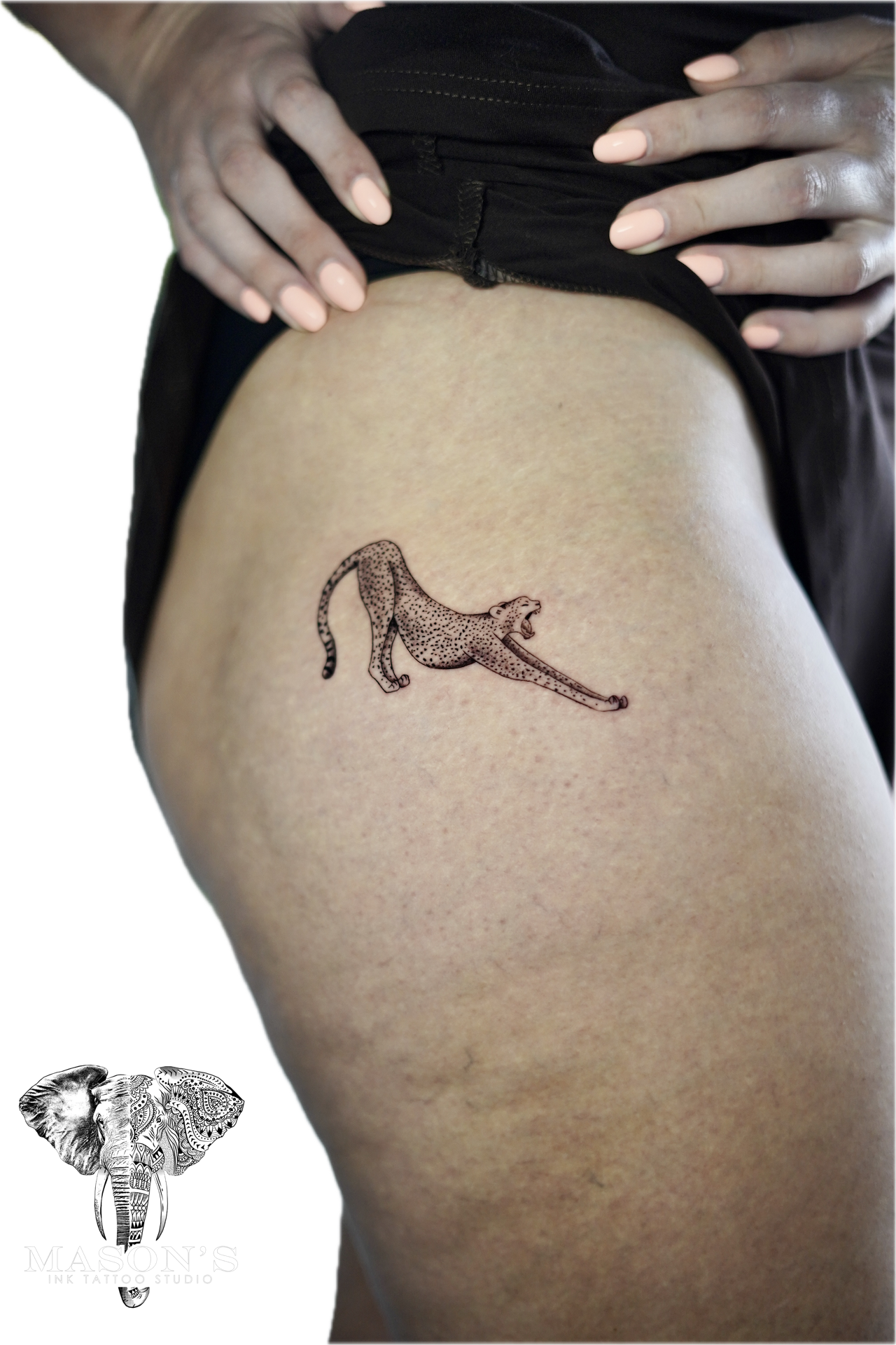 Discover this black and grey cheetah tattoo, crafted with detailed shading and dynamic composition at Mason’s Ink Tattoo Studio. This design captures the speed, agility, and elegance of the cheetah through realistic texture and strong contrast. Perfect for those searching for a tattoo Bali or Seminyak tattoo studio, we specialize in custom black and grey tattoos with professional craftsmanship and high-quality results.