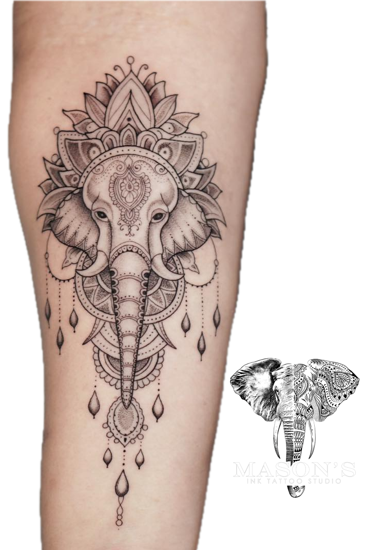 Ornamental Ganesha tattoo featuring intricate decorative patterns and detailed spiritual elements, symbolizing wisdom, protection, and prosperity. Crafted by Mason’s Ink Tattoo Studio with precise linework and balanced ornamental composition. Perfect for those searching for tattoo Bali or Seminyak tattoo artists specializing in ornamental and high-quality custom tattoos.